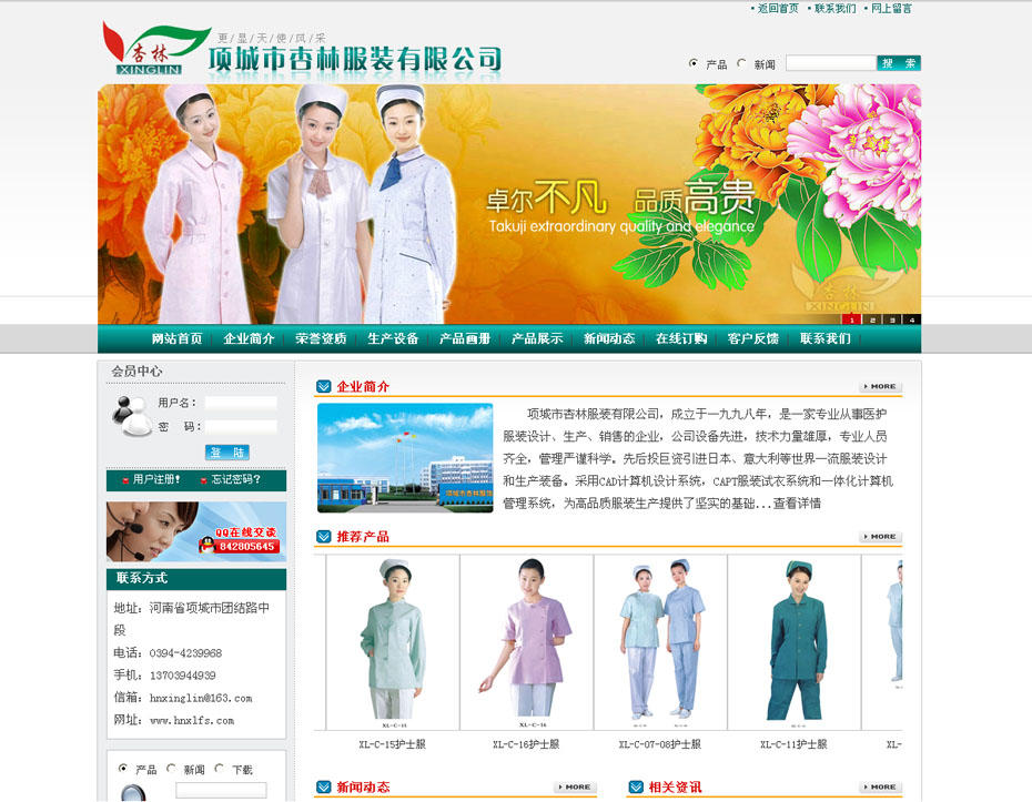 案例介紹:項城市杏林服裝有限公司,成立于一九九八年,是一家專業(yè)從事醫(yī)護服裝設計、生產(chǎn)、銷售的企業(yè),公司設備先進,技術力量雄厚,專業(yè)人員齊全,管理嚴謹科學。先后投巨資引進日本、意大利等世界一流服裝設計和生產(chǎn)裝備。采用CAD計算機設計系統(tǒng),CAPT服裝試衣系統(tǒng)和一體化計算機管理系統(tǒng),為高品質服裝生產(chǎn)提供了堅實的基礎,F(xiàn)主要經(jīng)營產(chǎn)品有:護士服系列、醫(yī)生服系列、手術服系列、工勤服系列、標志服系列及手術單、包布類、床上用品、醫(yī)用布料等。